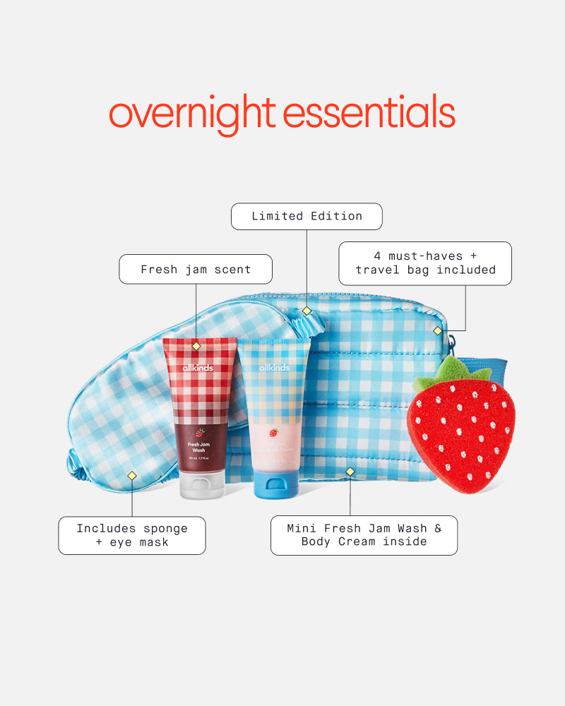 Road trip ? Flight out? Bestie sleepover ? No stress - we've got your back. This Fresh Jam-fragranced travel kit is packed with 4 must-have essentials, all packed into a cute bathroom bag made for going places. Whether it's a quick overnight stay or a week of nonstop fun, your fave fresh-from-the-breakfast-table vibes are coming with.