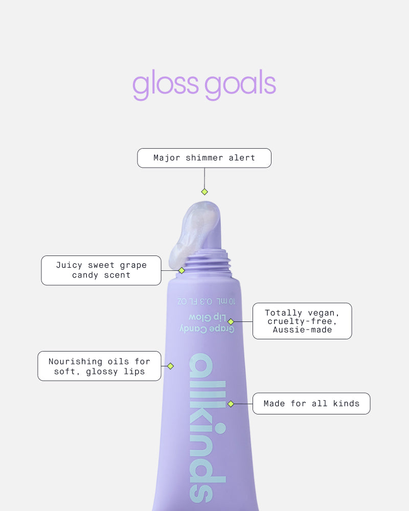 Major shimmer alert! This Grape Lip Glow lights up your lips with glimmery shine, nourishing oils and the juicy-sweet scent of grape candy. It's sparkle, it's shine - it's a total grape-tastic glow.