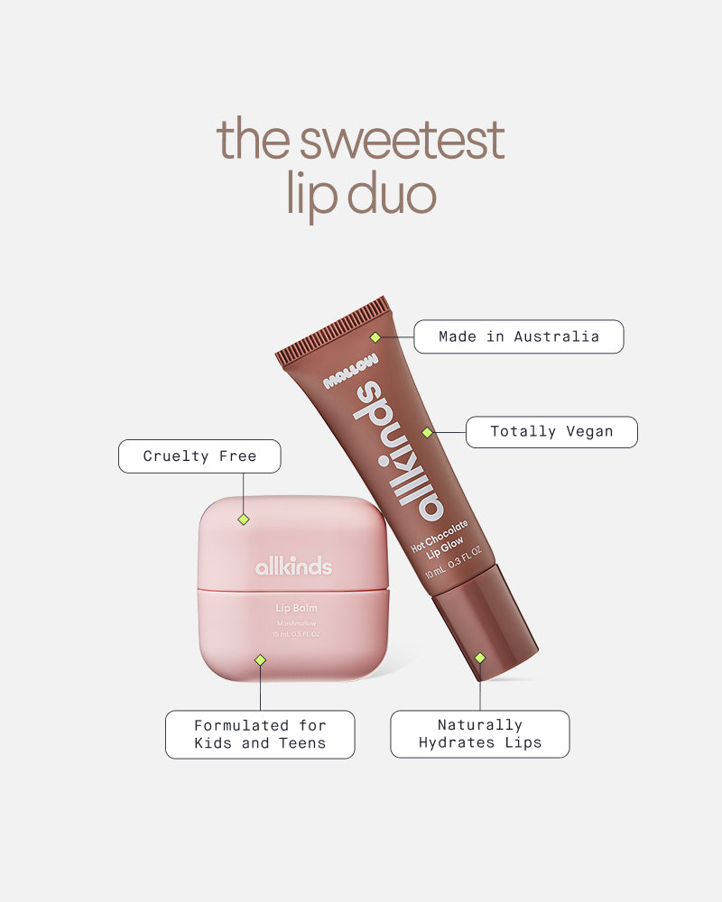 The ultimate power couple: Lip Glow and Balm come together in their fight to end dry lips. Balm provides the softness (thanks to Shea Butter and Vitamin E) while chocolate-flavoured Lip Glow brings the shine.