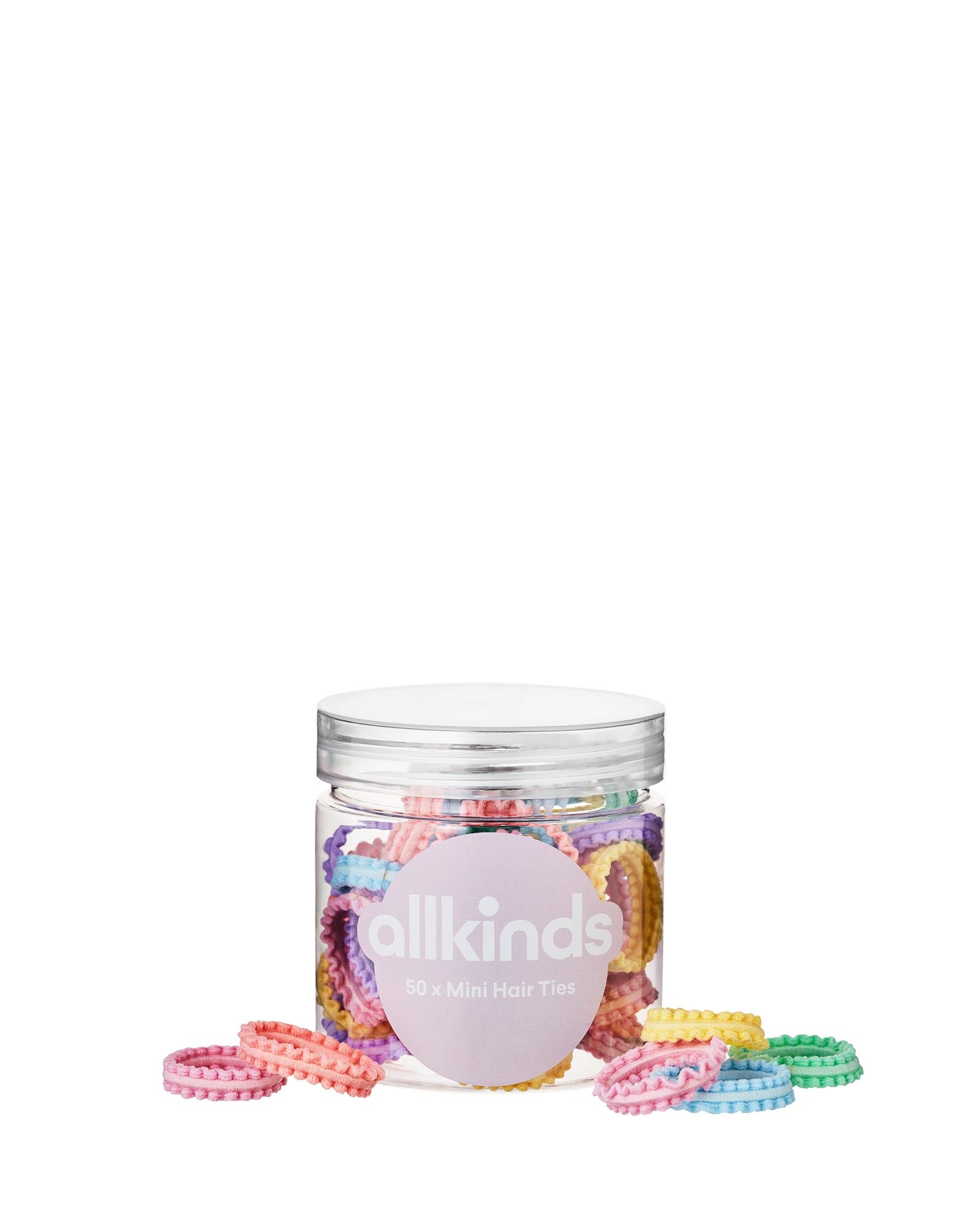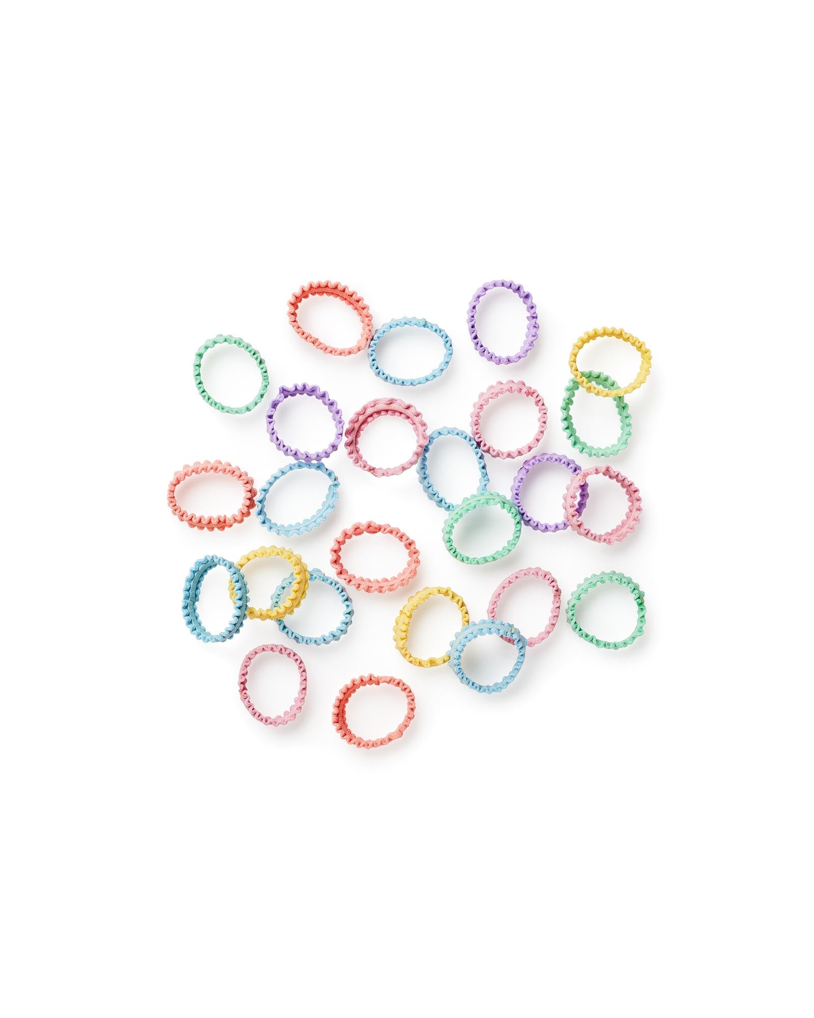 A set of 50 fun, pastel, stretchy hair elastics for all kinds of hair styling.