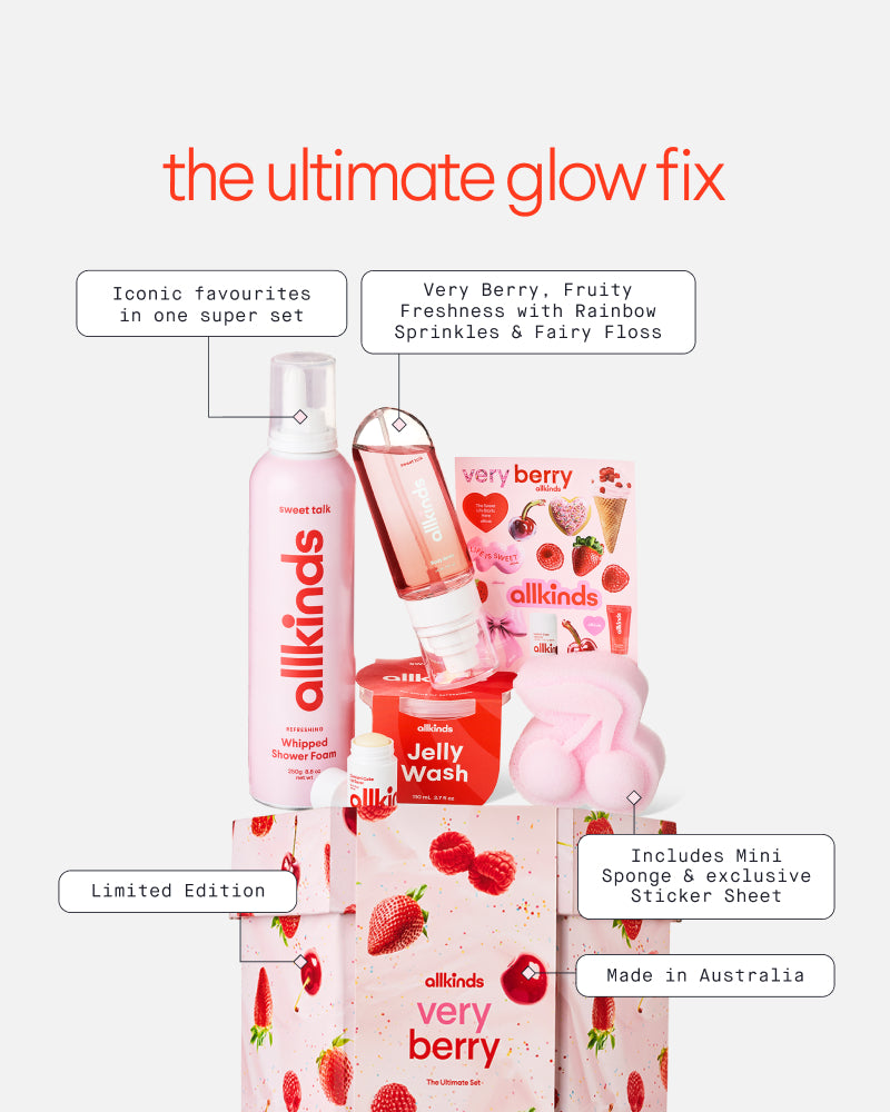 An iconic super set of Sweet Talk favourites that smell very berry, full of fruity freshness, includes a mini sponge and exclusive sticker sheet. You're one shower away from a sweeeeet party.
